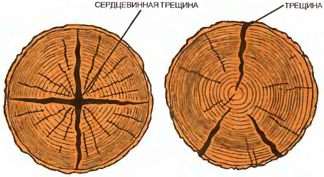 Следы воздействия. Большинство деревьев в течение жизни попадает под влияние факторов, которые оказывают отрицательное воздействие на нормальное развитие деревьев и оставляют на них следы в виде дефектов. Например, результатом гниения является сердцевинная трещина, которая, в свою очередь, вызывает расщепление дерева вдоль сердцевинных лучей. Трещины на поверхности появляются после падения дерева и являются следствием разделения древесины вдоль волокон и поперек годичных колец; последнее вызывается не одинаковой усадкой.