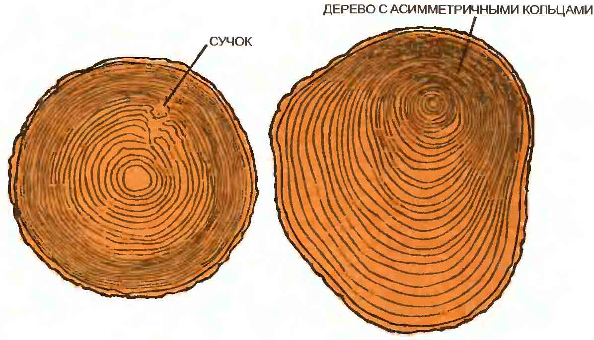 Сучки — это концы сломанных веток, которые не могут вновь вырасти на местах слома. Асимметричное расположение колец обнаруживается в деревьях, которые соприкасались друг с другом из-за сильных ветров или были освещены только с одной стороны.